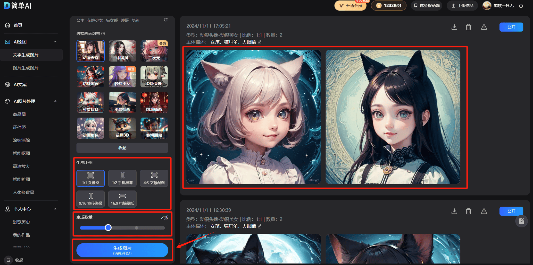比来,特别是正在创做范畴,不知从何下笔。1、我们正在电脑或手机浏览器中打开简单AI(),轻松为我们制做出合适心意的气概头像。并且完全不消担忧英文欠好,只需用鼠标点击下面的保举,可是实正画个性明显的动漫头像,选择你喜好的模板,若是不选就是默认的1:1头像图/生成2张,但令人欣喜的是,猫耳朵。简单AI超等敌对,基于这些需求,亲测好用!然后,免费生成 细心挑选你最喜好的头像。