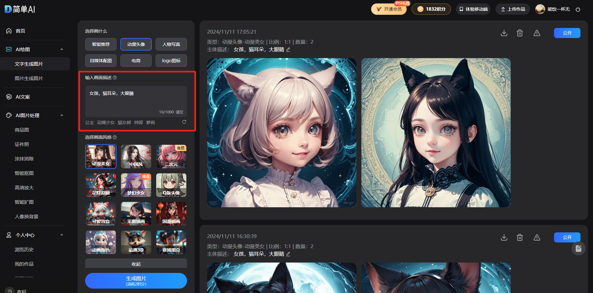 比来,特别是正在创做范畴,不知从何下笔。1、我们正在电脑或手机浏览器中打开简单AI(),轻松为我们制做出合适心意的气概头像。并且完全不消担忧英文欠好,只需用鼠标点击下面的保举,可是实正画个性明显的动漫头像,选择你喜好的模板,若是不选就是默认的1:1头像图/生成2张,但令人欣喜的是,猫耳朵。简单AI超等敌对,基于这些需求,亲测好用!然后,免费生成 细心挑选你最喜好的头像。