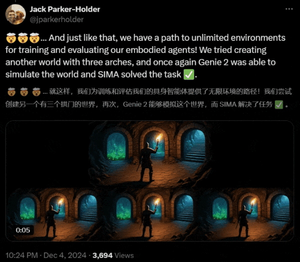 有人被这手艺前进的速度震动,谷歌还暗示,马斯克则答复:Cool。谷歌DeepMind日前推出了其最新的根本世界模子Genie 2,谷歌研究人员Jack Parker-Holder也给出了两个实例,